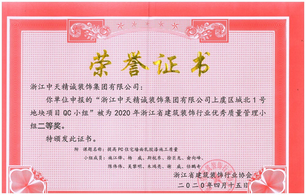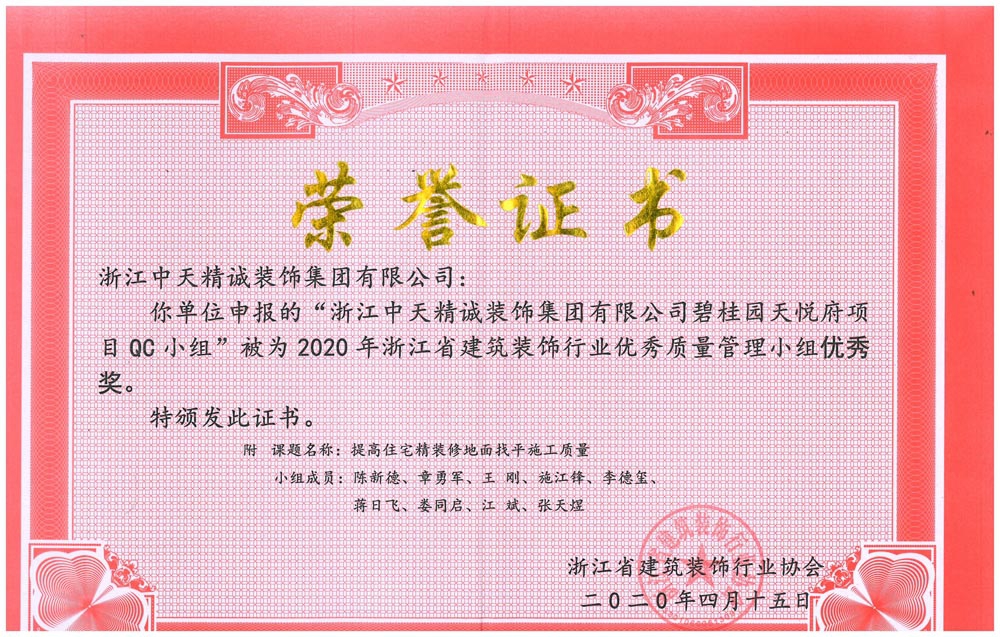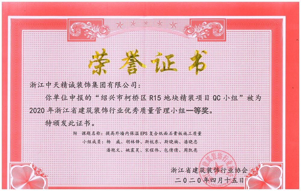 近日,浙江省建筑裝飾行業協會公布2020年浙江省建筑裝飾行業質量管理小組活動成果,經協會初審及專家委員會綜合評審,中天精誠裝飾三項QC成果獲獎。