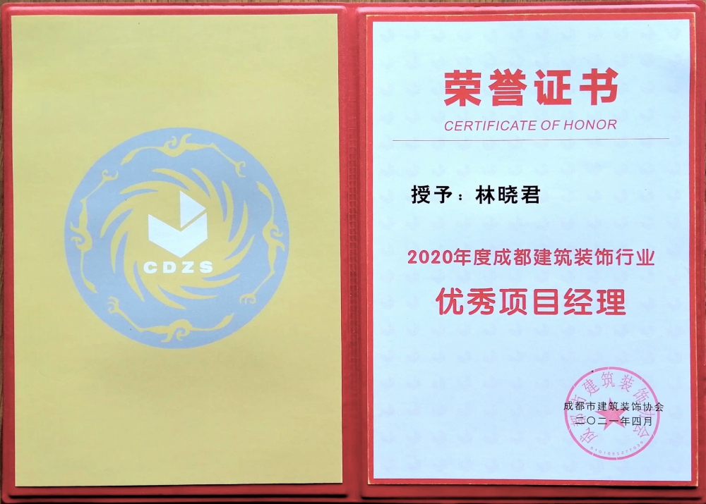 2021年4月,中天精誠(chéng)裝飾榮獲成都建筑裝飾協(xié)會(huì)“2020年度成都建筑裝飾行業(yè)先進(jìn)企業(yè)”榮譽(yù)稱(chēng)號(hào)。項(xiàng)目經(jīng)理沈濟(jì)紅、林曉君兩人榮獲“2020年度成都建筑裝飾行業(yè)優(yōu)秀項(xiàng)目經(jīng)理”稱(chēng)號(hào)。