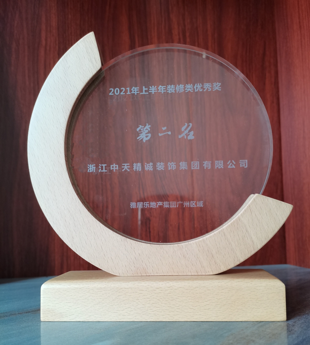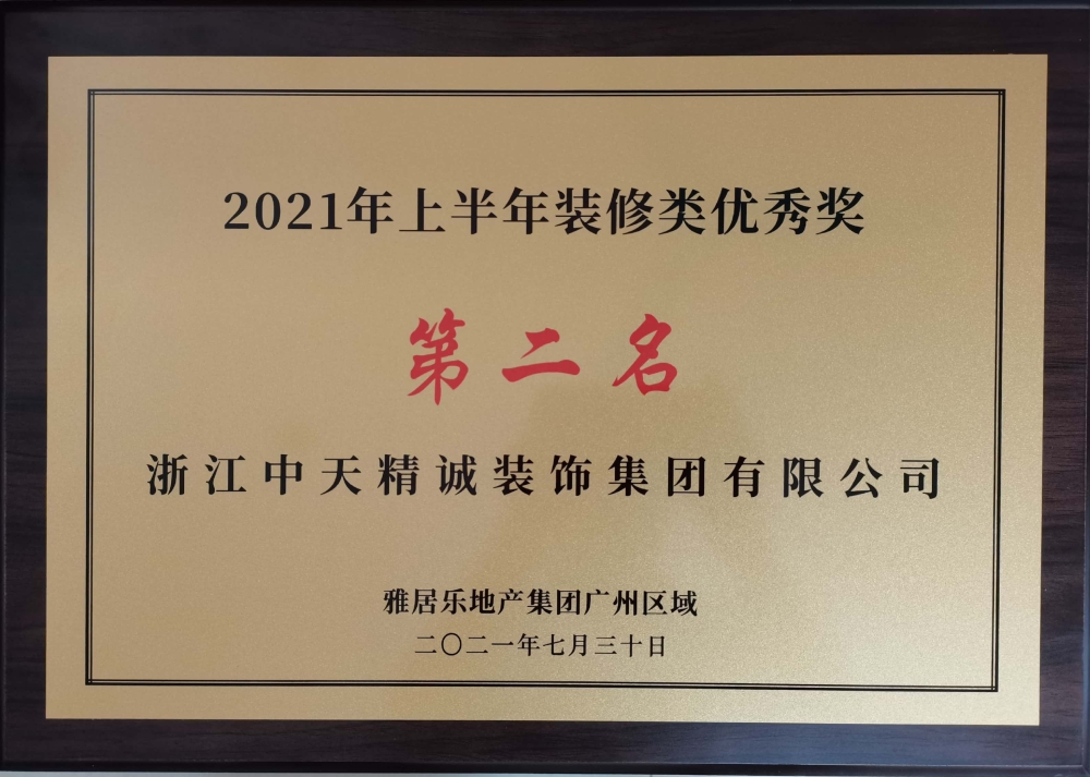 近日,中天精誠(chéng)裝飾榮獲雅居樂地產(chǎn)集團(tuán)廣州區(qū)域2021年上半年裝修類優(yōu)秀獎(jiǎng)第二名。