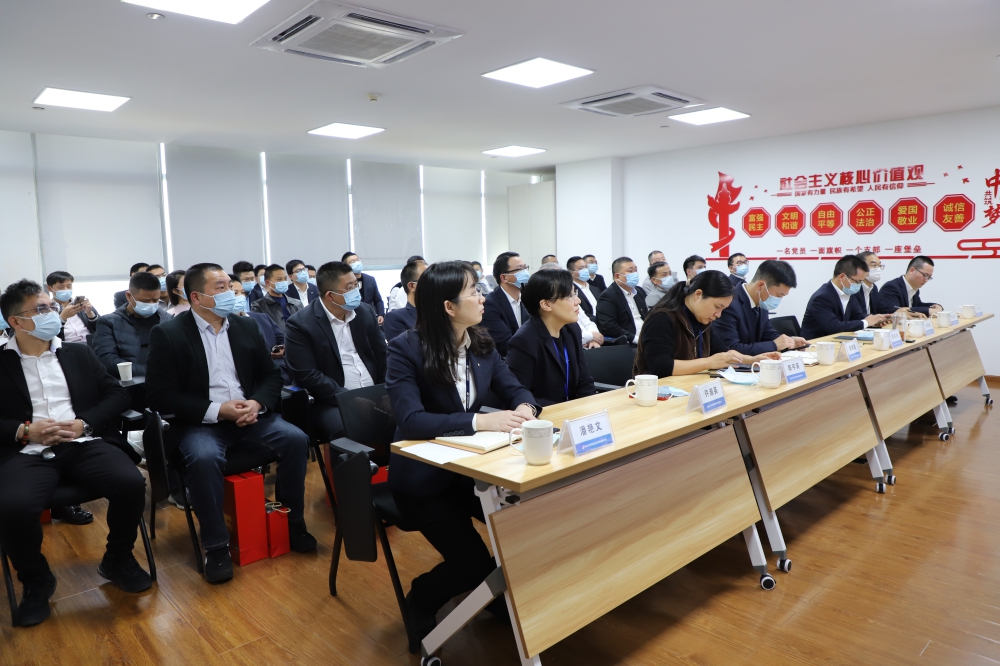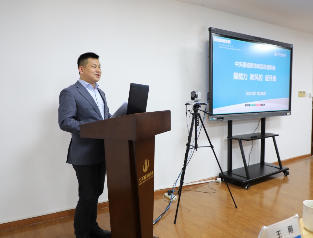 隨后,中天精誠裝飾副總經理潘曉忠、總工程師王剛、總經理助理陳宇英分別就《在市場變局下求發展》、《數字化建造的發展和推進》、《稅務管理》進行講解、宣貫和分享。最后,中天精誠裝飾副總經理陳新德對結算、應收款工作情況推進及工程管理大檢查進行通報。